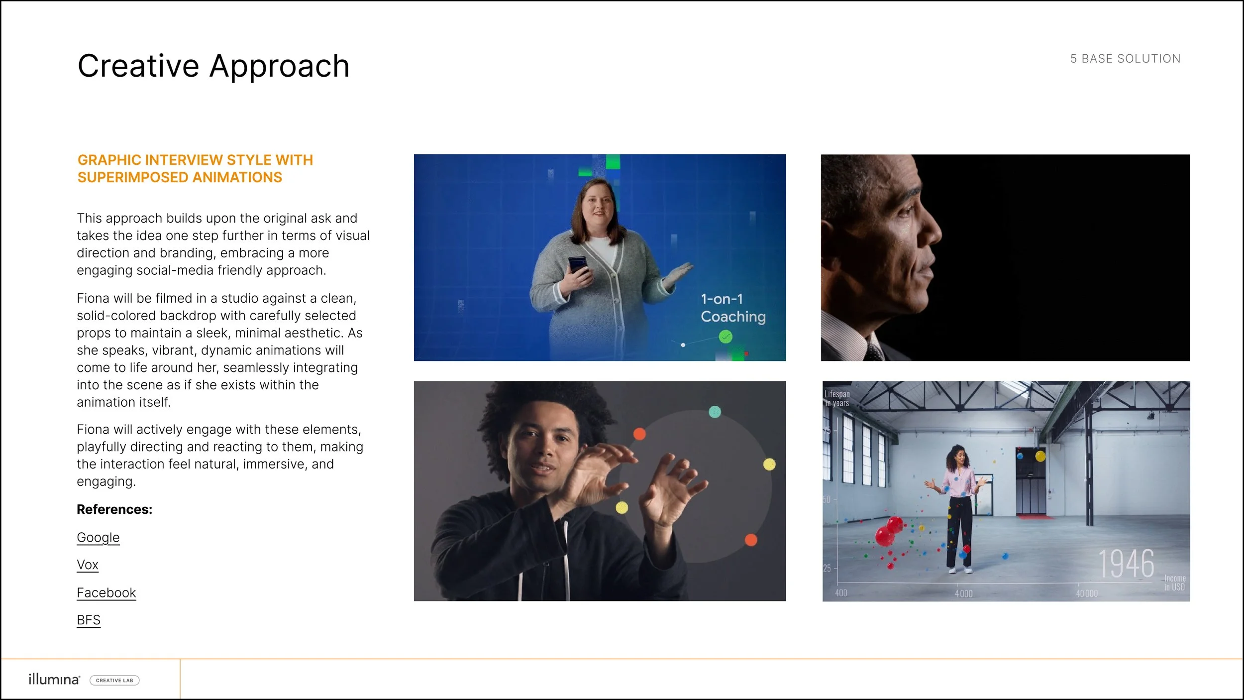 and video director/editor, we brainstormed various concepts and approaches. We collectively agreed on the strongest approach to effectively showcase the information: an interview style featuring overlaid graphic animations to visually support the spoken content. Our presentation document utilized AI-generated images to illustrate the intended filming environment and provided static examples of on-screen text and potential motion graphics.