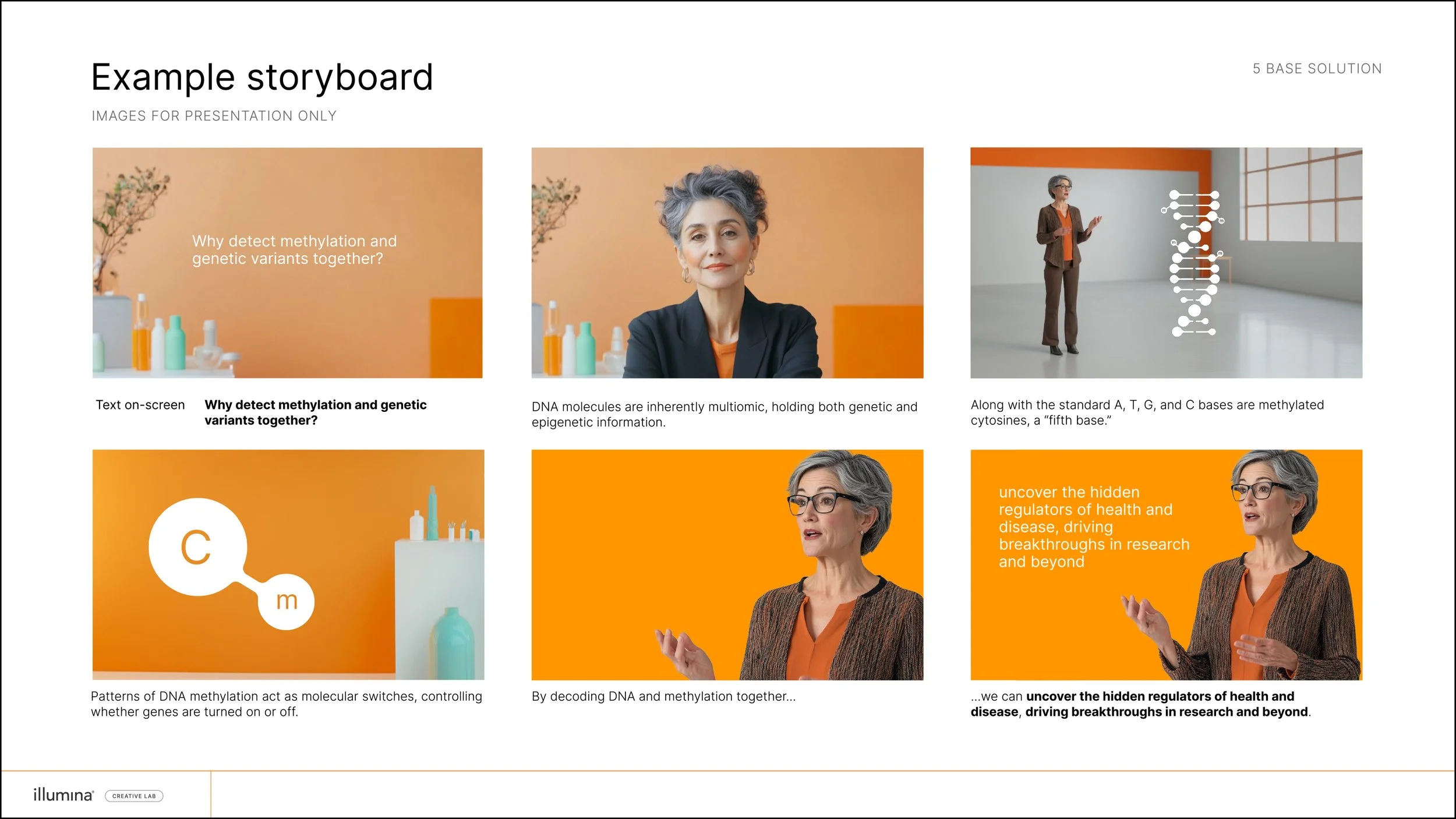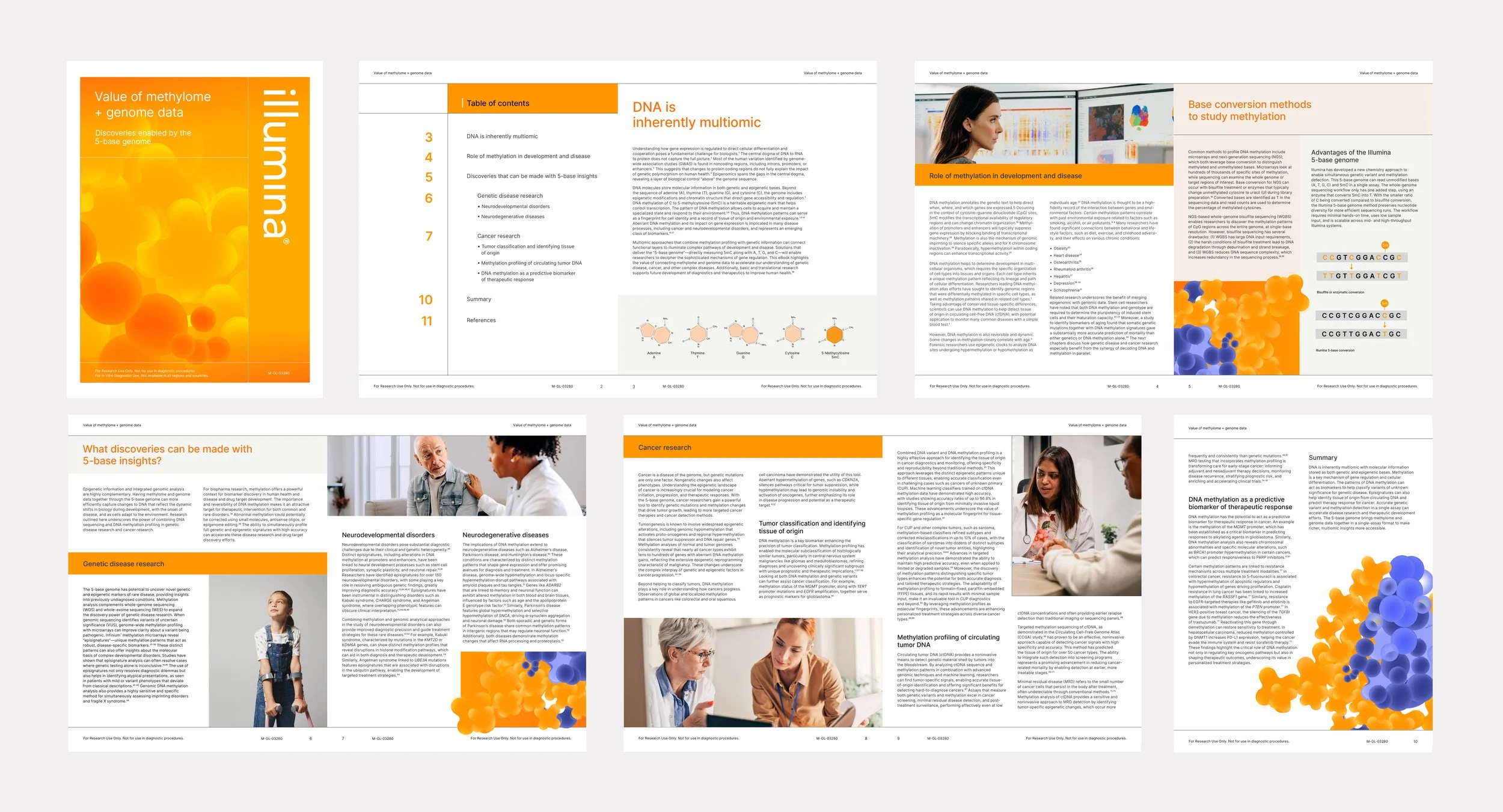 The launch of Illumina's groundbreaking 5-base Solution introduced a revolutionary method for concurrently measuring DNA methylation and genetic variation, delivering exceptional accuracy, simplicity, and scale. The comprehensive campaign supporting this launch featured a central video asset, designed for adaptability and segmented use across social media, complemented by a suite of print materials intended for targeted distribution.